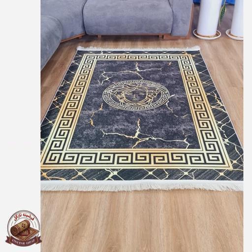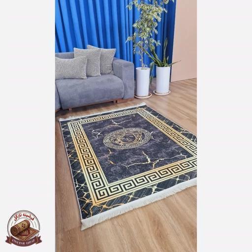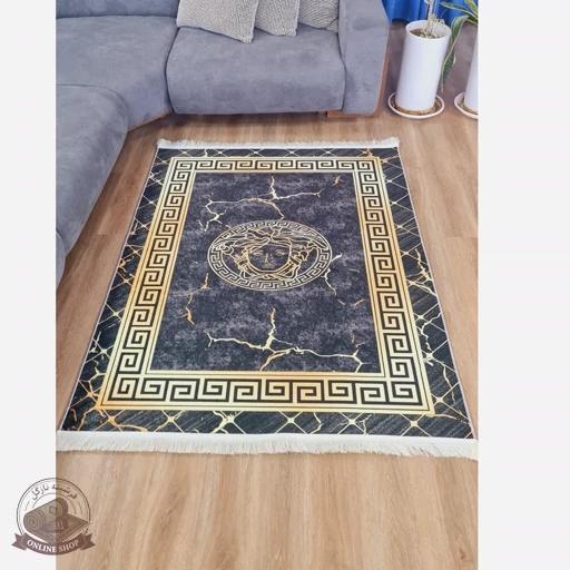 فرش مشکی طلایی مدرن — جنس مخمل تُرک با پشت استُپ دار (ضد سر) — ارسال در بستهبندی شیک، پرداخت پس کرایه