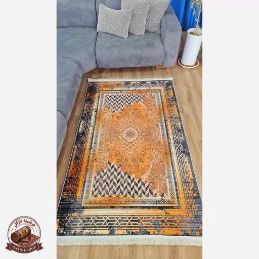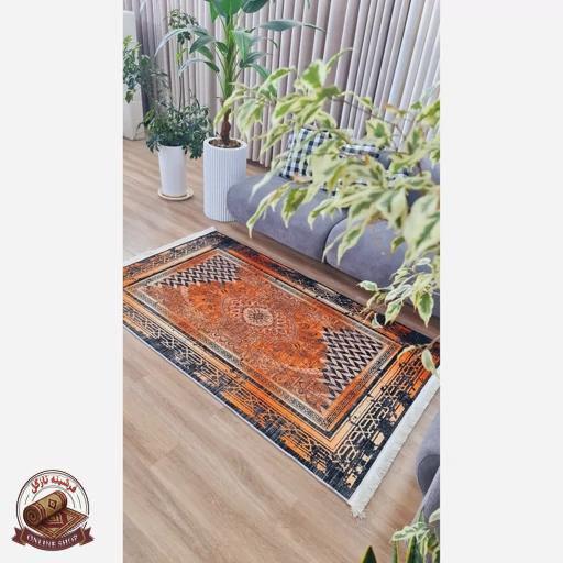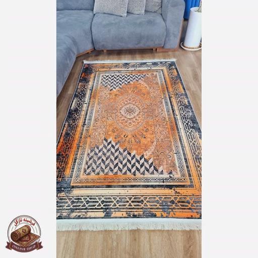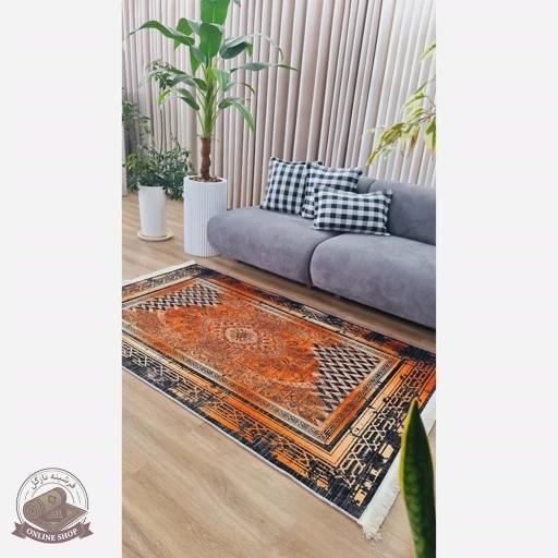 فرشی مدرن و چشمگیر با طراحی وینتیج در ترکیب رنگ نارنجی و مشکی، مناسب برای فضاهای پذیرایی، نشیمن و اتاقخواب. مخمل ترک با لطافتی چشمگیر، پشت استُپدار ضد لغزش و امکان سفارش در هر سایز دلخواه. گارانتی 2 ساله شستشو.
